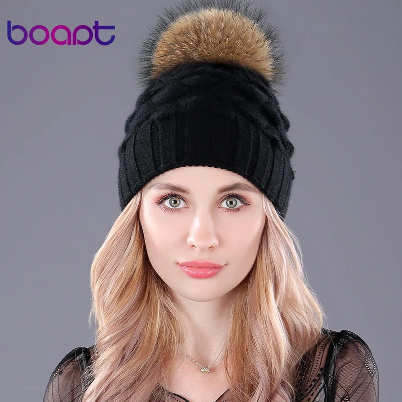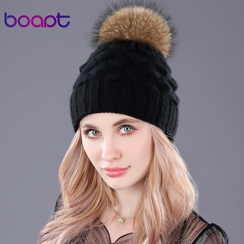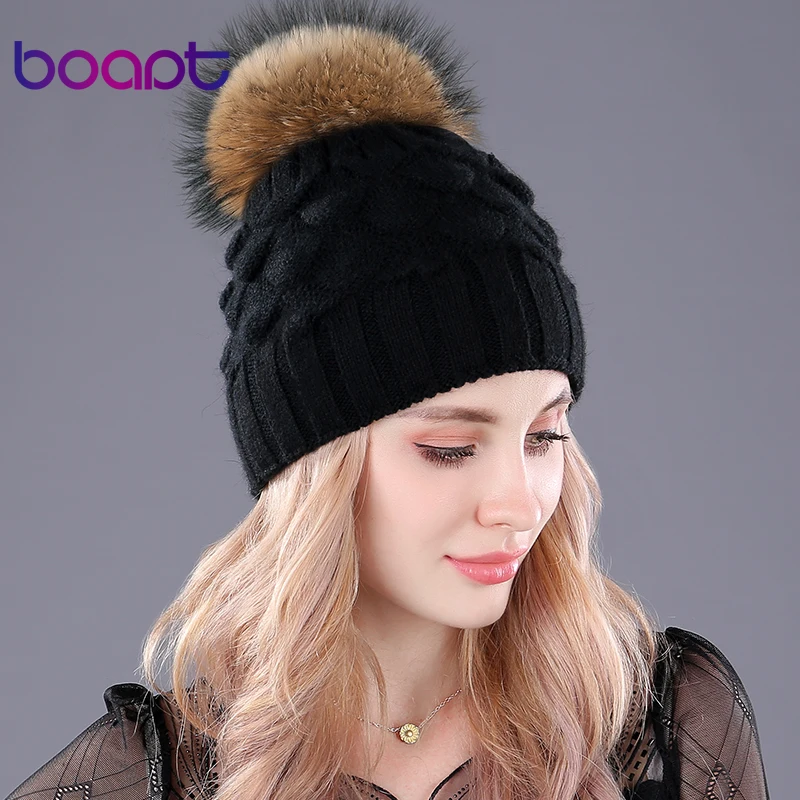 Special Offer [boapt] рыба масштаб украшение Двухъярусный шерсть головные уборы Женский зима вязаный колпачки шапочки подлинный енот мех пом пом для женски... Discount 48% Today!